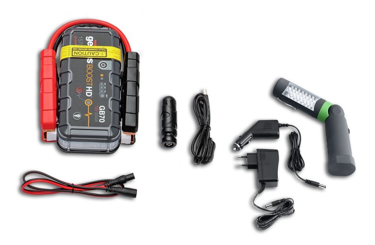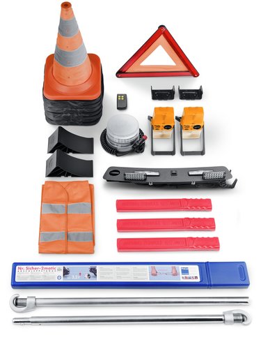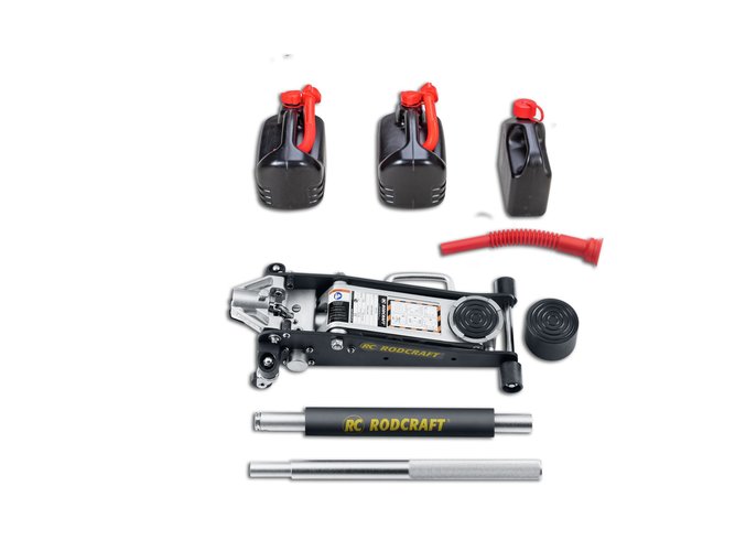 Wagenheber, Distanzblock , Wasserkanister , Treibstoffkanister und Ausgießstutzen